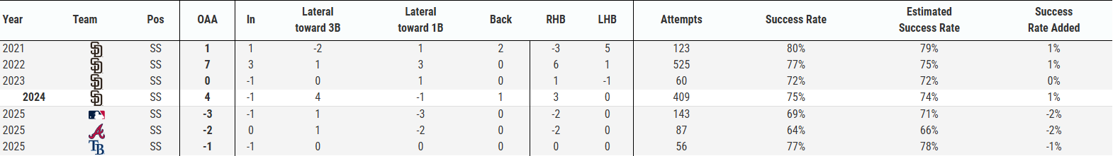 김하성의 유격수 OAA(Outs Above Average)는 2022년 7, 2024년 4를 기록하며 평균 이상의 수비수였다. 하지만 2024년 8월에 입은 어깨 부상과 올해 허리 부상 등으로 인해 김하성의 OAA는 -3으로 하락했다.