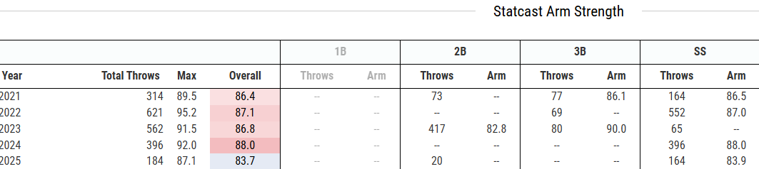 특히 어깨 부상의 여파는 송구 능력 감소에서 드러난다. 87~88마일대의 송구를 보여주던 김하성은 올해 83.7마일의 평균 이하 수치를 보여줬다.
