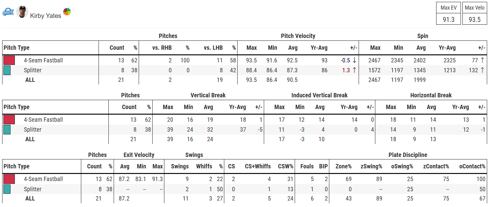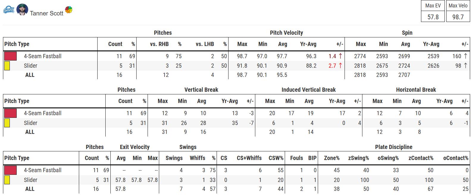 스캇은 전체적으로 구속이 상승했다. 최고 98.7마일까지 기록하며 구속이 회복된 모습을 보여줬다. 땅볼-삼진-볼넷-삼진을 기록했다.