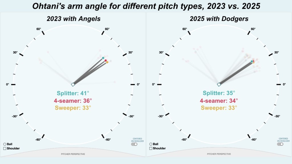 이 변화는 아마도 오타니가 낮은 팔 각도에서 스플리터를 던지기 시작한 것과 관련이 있다. (2023년에는 41도였던 팔 각도가, 2025년에는 35도로 낮아졌다.) 덕분에 그의 다른 구종들과 릴리스 포인트가 더 비슷해졌다. (패스트볼은 34도, 스위퍼는 33도.) 이렇게 옆으로 기울어진 투구폼은 대체로 더 많은 좌우 무브먼트를 만들어낸다.